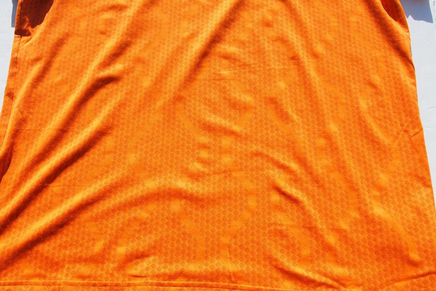 レギュラーフィットで、リブ襟のメッシュジャカードになっていて、胸と背中中央にシリコンブリッジプリントがあります。