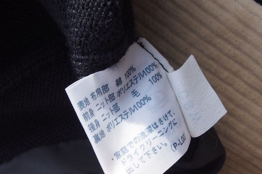表地:コットン100%、前身:(ニット部)ポリエステル100%、後身(ニット部):ウール100%、裏地:ポリエステル100%