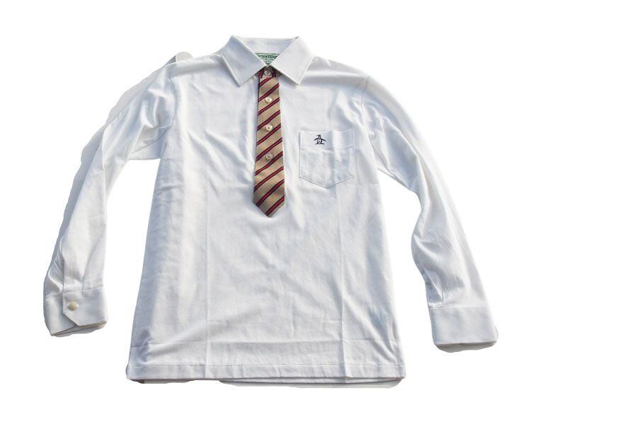レジメンタル柄の生地がポロシャツに取り付けられていて、まるでネクタイをしているようなポロシャツになっています。